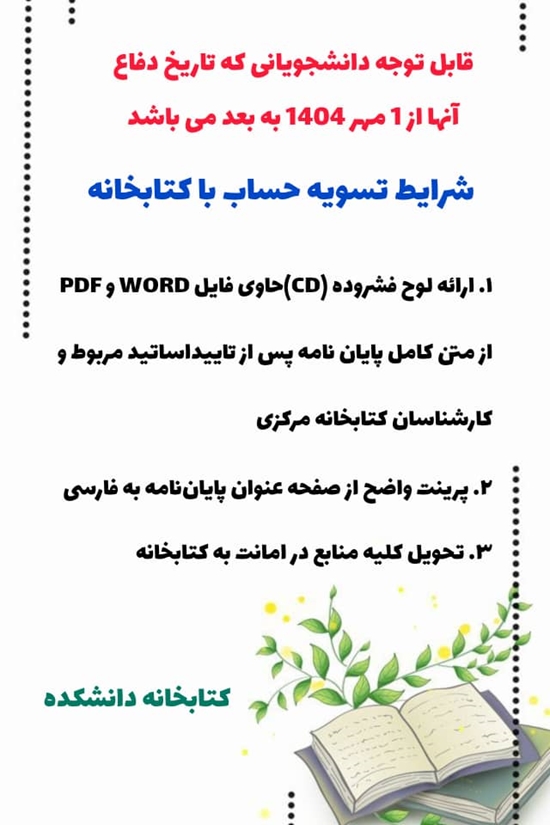 وی افزود: آن دسته از دانشجویانی که تاریخ دفاع آنها از 1 مهر 1404 به بعد می باشد برای تسویه حساب با کتابخانه مواردی که در ادامه ذکر می شود را باید در نظر داشته باشند: